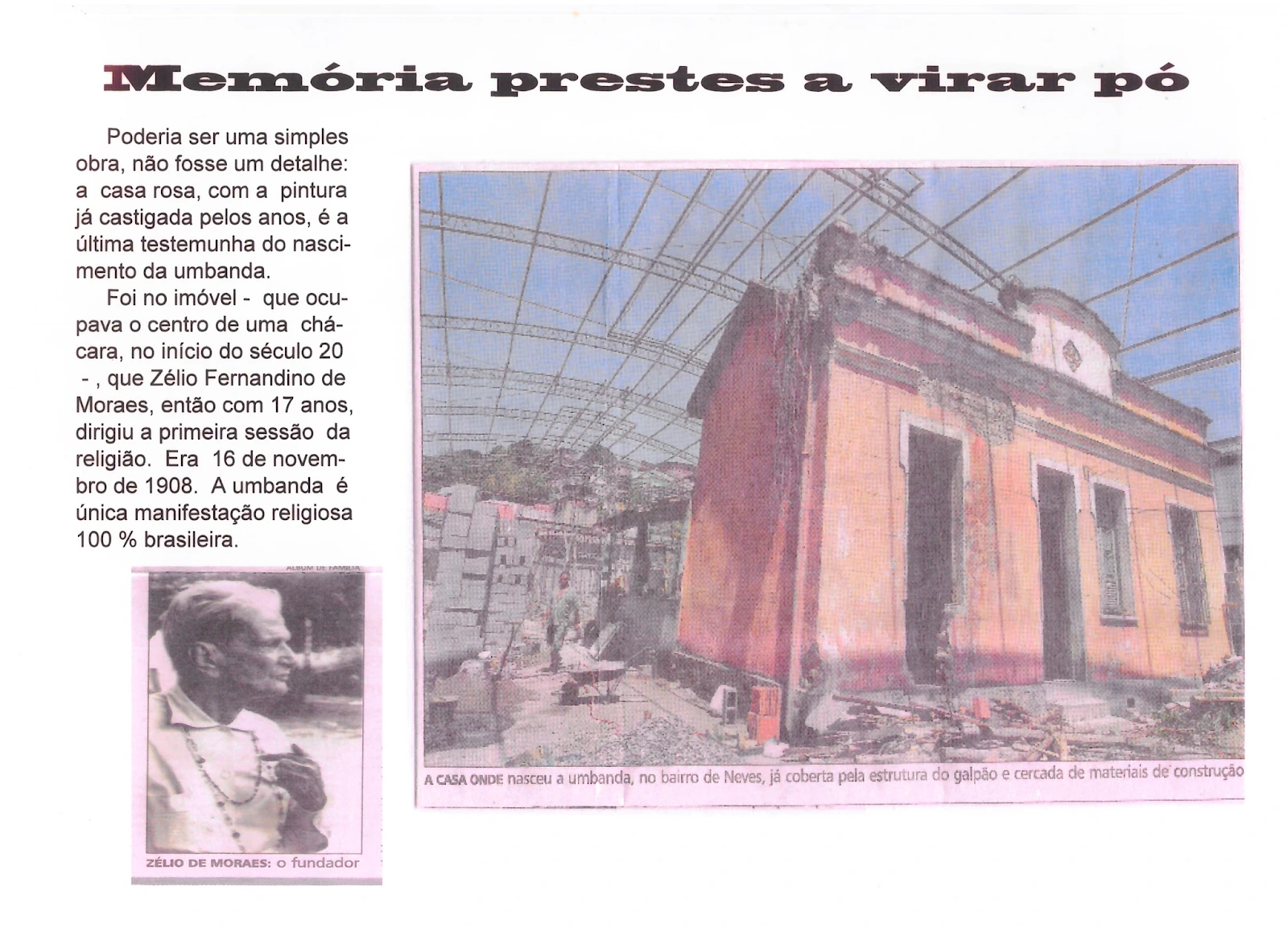 Zélio Fernandino de Moraes, dedicou 66 anos de sua vida à Umbanda, tendo retornado ao Plano Espiritual em 03 de outubro de 1975, com a certeza de missão cumprida.