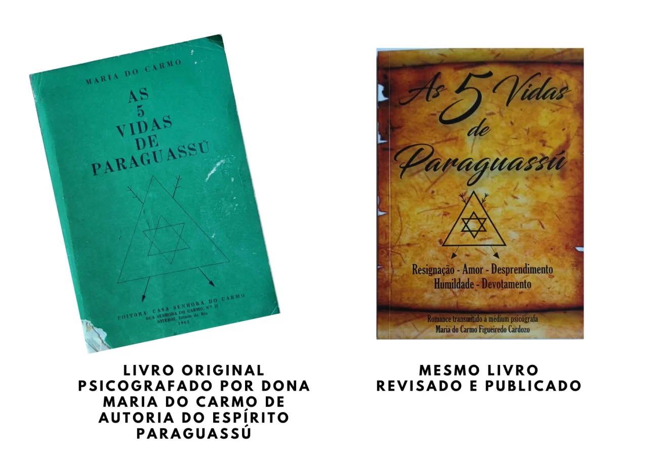 - Exemplar original e outro atualizado do Livro “As Cinco Vidas de Paraguassú”, escrito por psicografia entre Paraguassú e dona Maria do Carmo:
